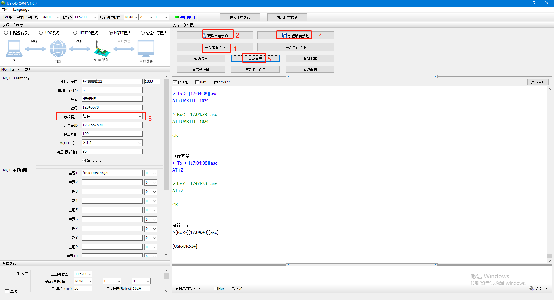 (7)MQTT主題訂閱:主題1填寫/USR-DR514/get