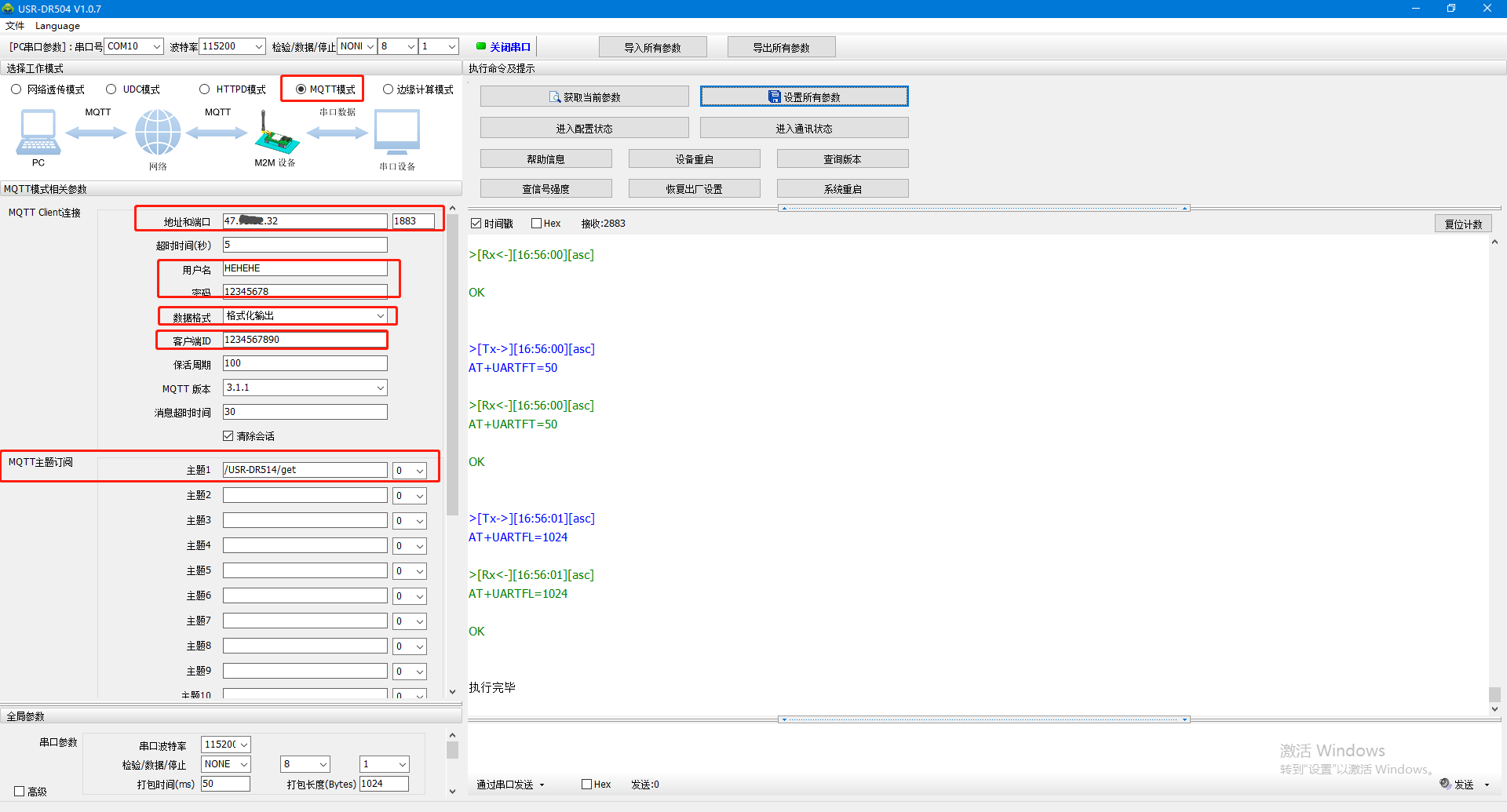 4、MQTT.fx軟件推送,USR-DR514訂閱測試(數(shù)據(jù)格式是格式化輸出)