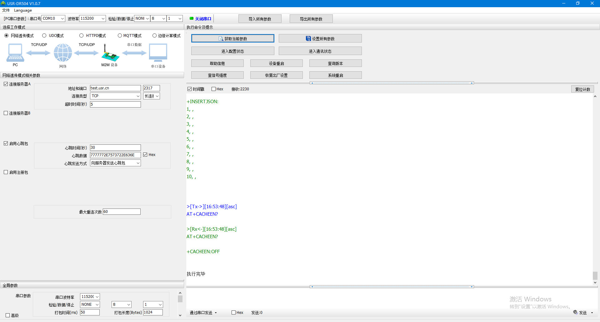 (1)USR-DR514打開設(shè)置軟件,選擇COM10,點擊進(jìn)入配置狀態(tài),點擊獲取當(dāng)前參數(shù),數(shù)據(jù)格式設(shè)置透傳,點擊設(shè)置所有參數(shù),點擊設(shè)備重啟,最后點擊關(guān)閉串口。