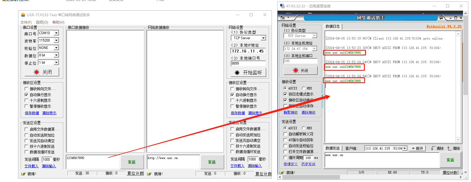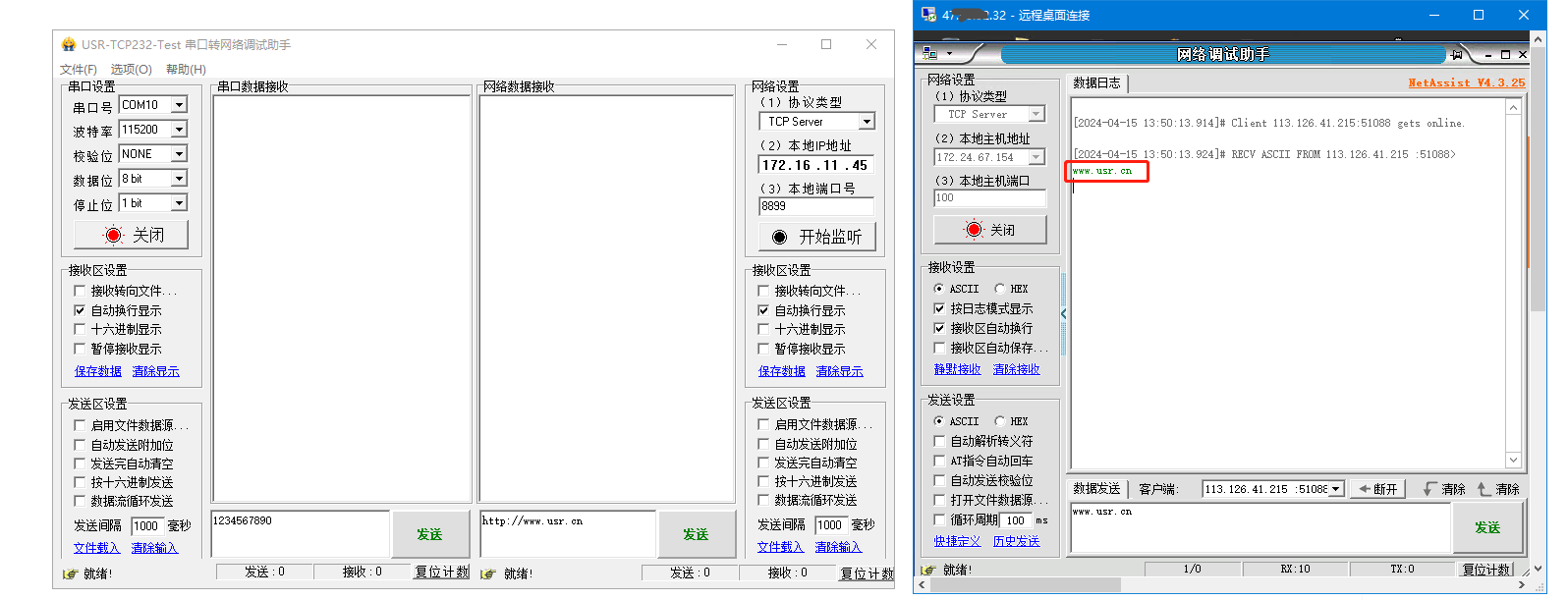 登陸遠(yuǎn)程桌面連接,打開一個網(wǎng)絡(luò)助手,協(xié)議類型TCP server,服務(wù)器IP,本地端口100和DR514一樣,點擊連接。