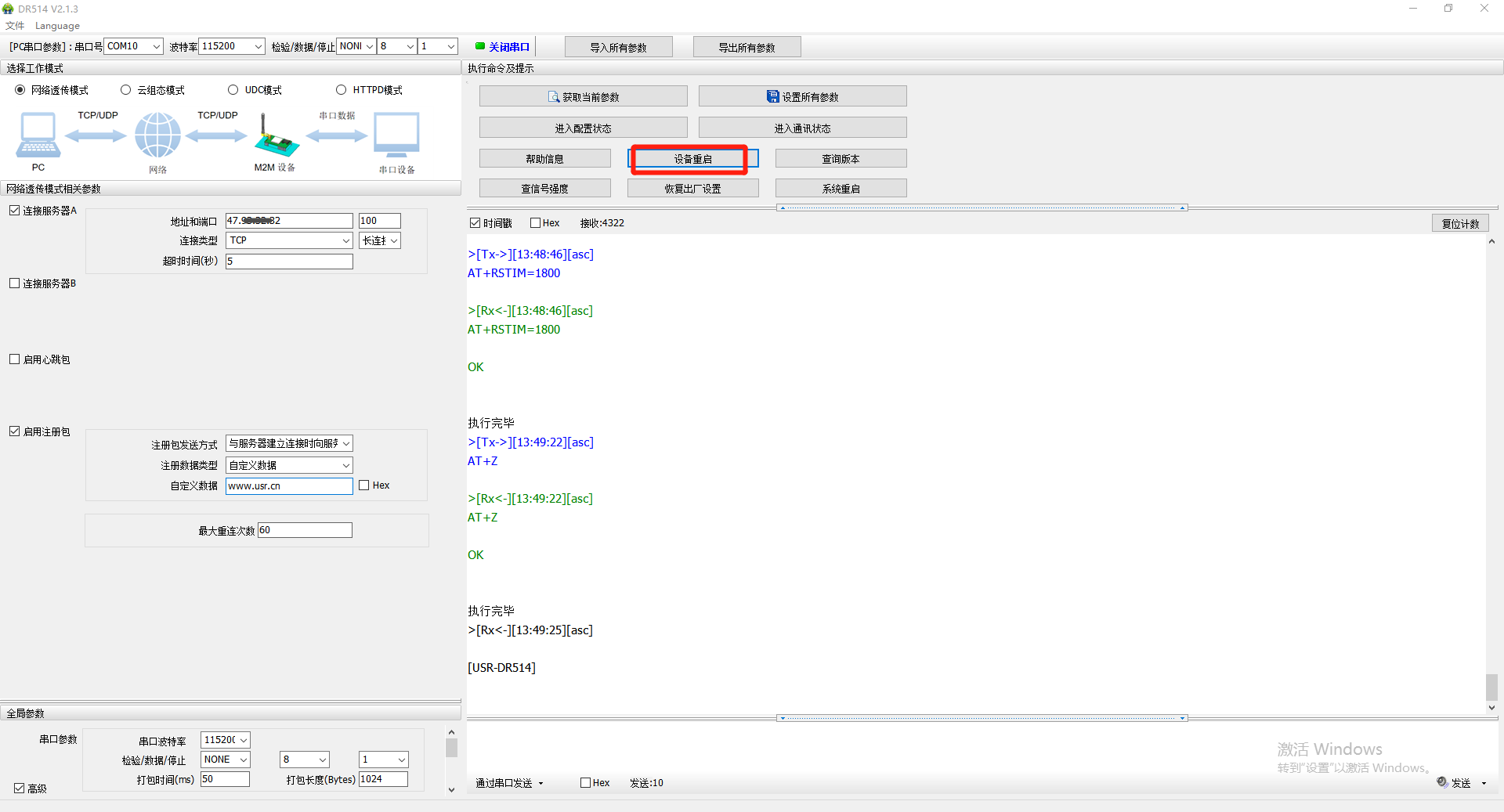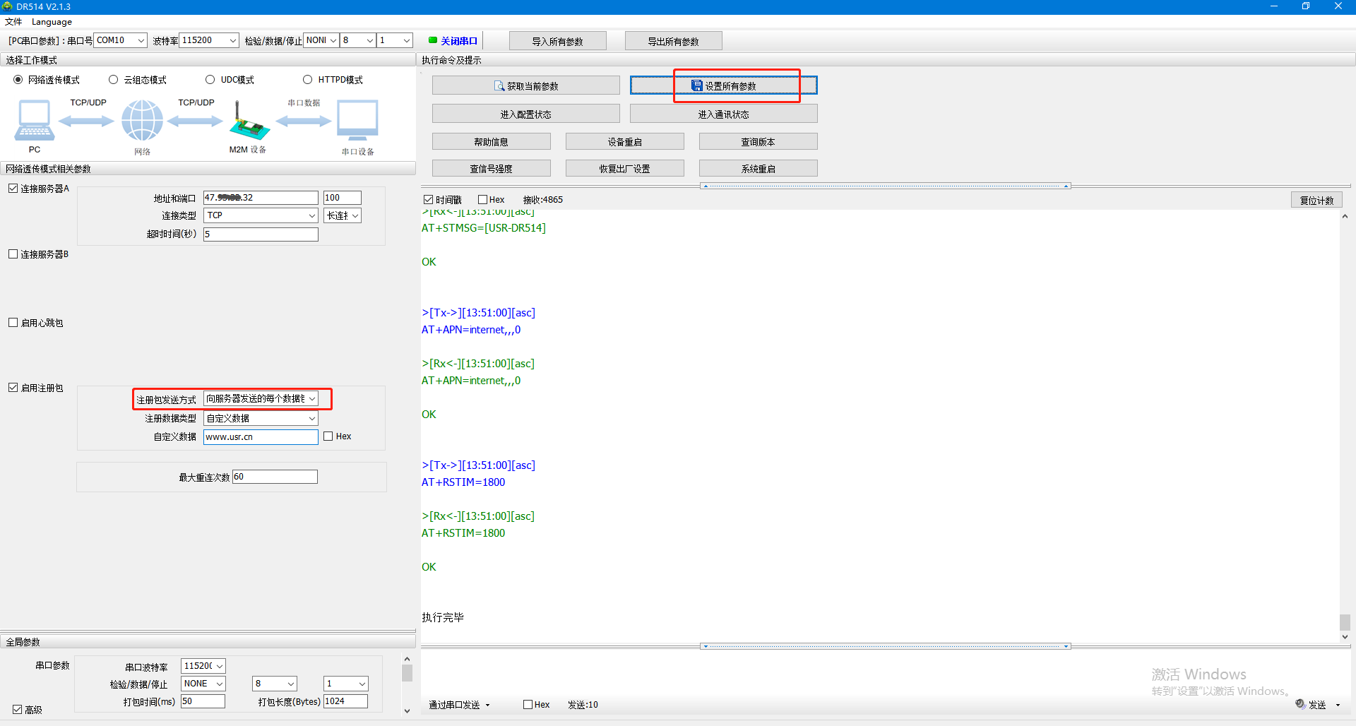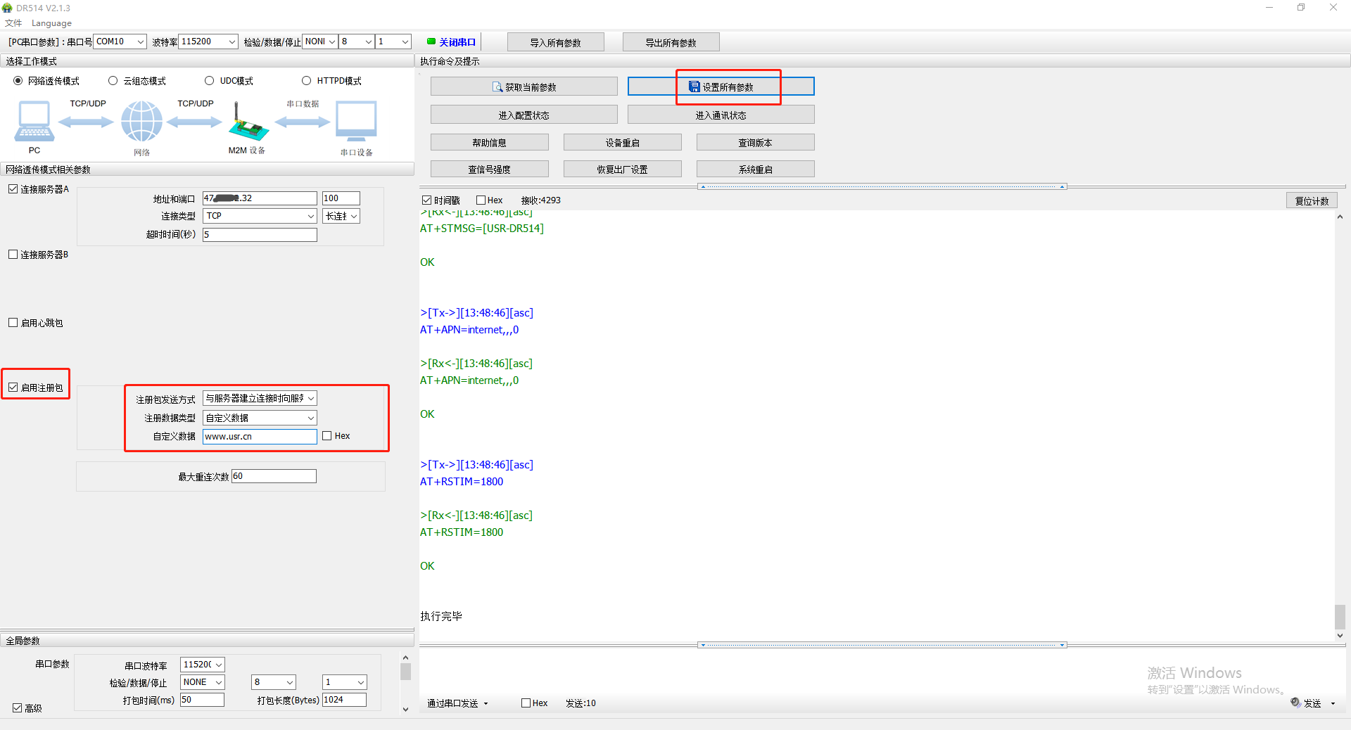設(shè)置軟件重新打開串口,點擊進入配置狀態(tài),點擊獲取當(dāng)前參數(shù),注冊包發(fā)送方式選向服務(wù)器發(fā)送的每個數(shù)據(jù)包前都加上,注冊數(shù)據(jù)類型用自定義數(shù)據(jù),自定義數(shù)據(jù)helipaomo.cn,點擊設(shè)置并保存所有參數(shù)。