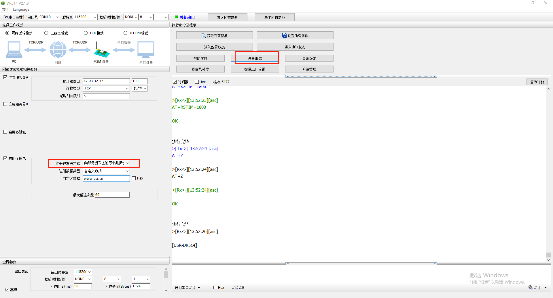4、勾選連接服務(wù)器A,地址設(shè)置遠(yuǎn)程服務(wù)器IP,端口100,連接類型TCP,長連接,勾選啟用注冊包,注冊包發(fā)送方式選與服務(wù)器建立連接時向服務(wù)器發(fā)送一次,注冊數(shù)據(jù)類型用自定義數(shù)據(jù),自定義數(shù)據(jù)helipaomo.cn,點擊設(shè)置所有參數(shù)。點擊設(shè)備重啟,然后再關(guān)閉串口。