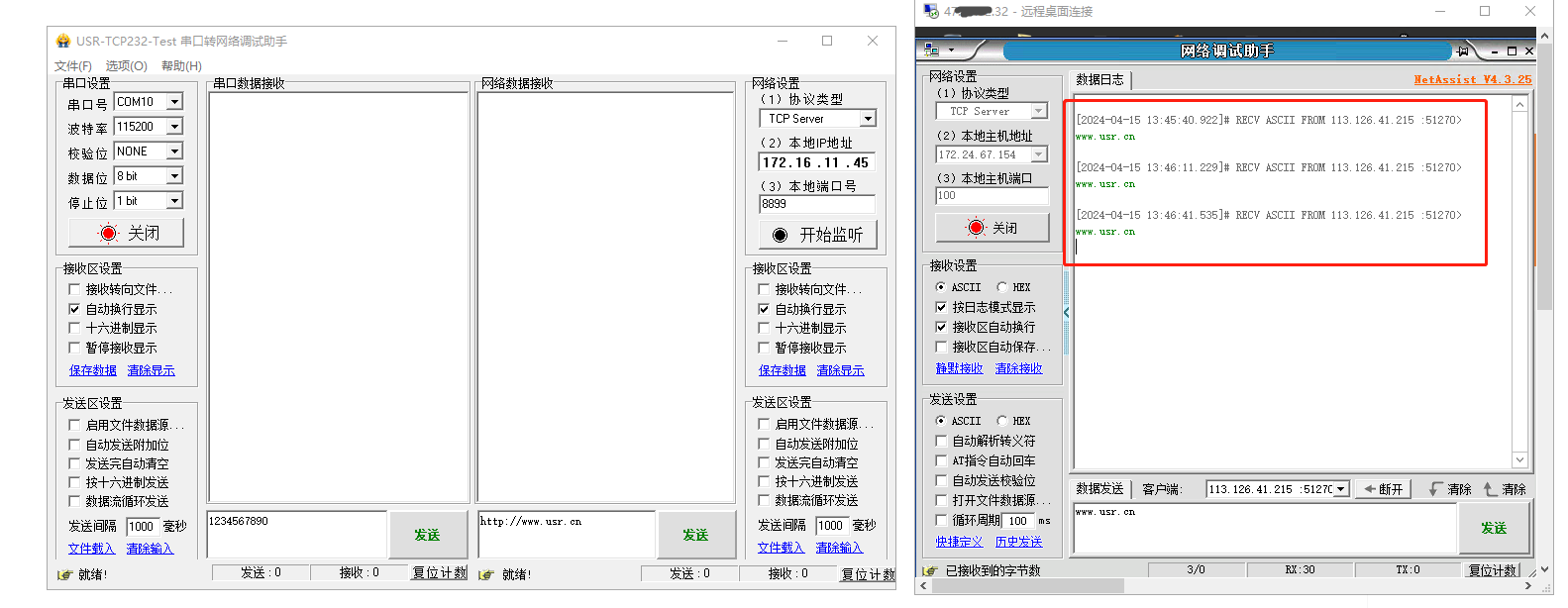 登陸遠(yuǎn)程桌面連接,打開一個網(wǎng)絡(luò)助手,協(xié)議類型TCP server,服務(wù)器IP,本地端口100和DR514一樣,點擊連接。