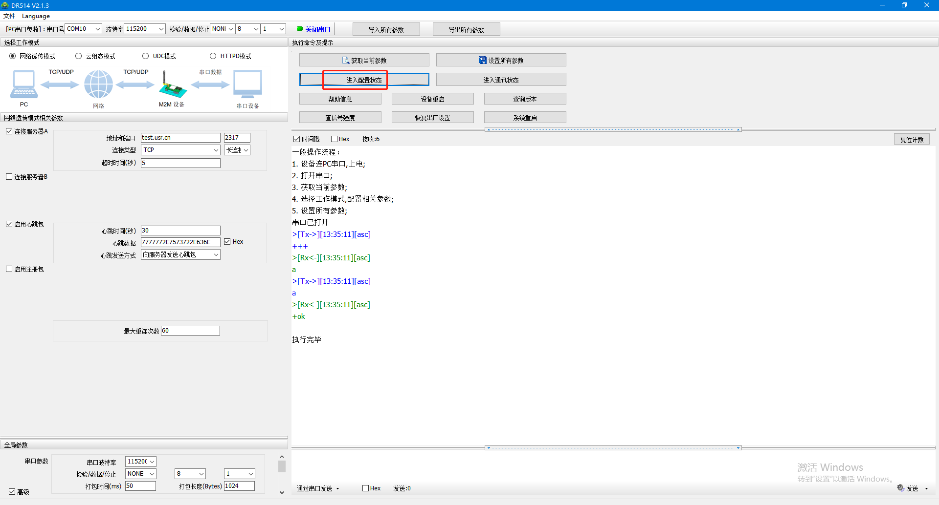 2、打開串口,點擊進(jìn)入配置狀態(tài)。