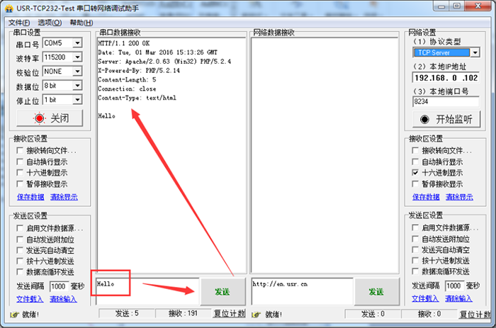 6、將WiFi模塊的串口連接到電腦串口,使用串口調(diào)試助手發(fā)送提交數(shù)據(jù),返回ok表示測(cè)試成功。
