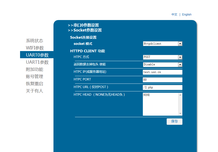 5、模塊設(shè)置參數(shù):登錄設(shè)置網(wǎng)頁(yè),模塊設(shè)置為Httpd Client模式,請(qǐng)求方式,設(shè)置服務(wù)器地址,端口,保存。重啟模塊。(本說(shuō)明文檔使用為有人測(cè)試服務(wù)器)
