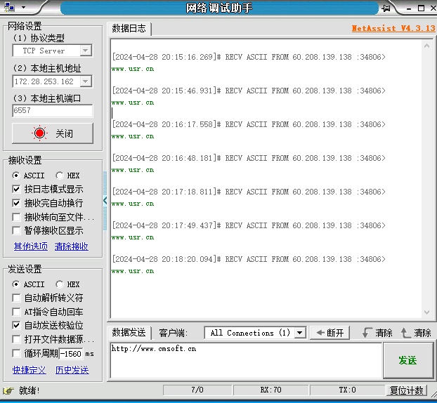 登陸遠(yuǎn)程桌面連接,打開(kāi)一個(gè)網(wǎng)絡(luò)助手,協(xié)議類(lèi)型TCP server,服務(wù)器IP,本地端口6557和USR-G781一樣,點(diǎn)擊連接。