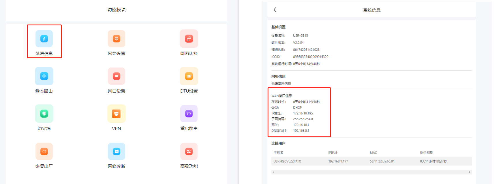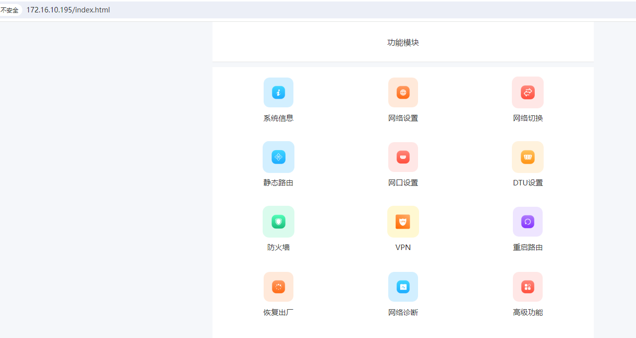 1、 首次使用 USR-G815 設(shè)備時,可以通過 PC 連接 USR-G815 的 LAN 口,自動獲取同網(wǎng)段的IP 192.168.1.X,瀏覽器輸入G815的LAN IP:192.168.1.1進(jìn)入內(nèi)置網(wǎng)頁。