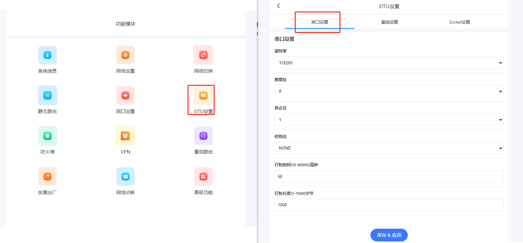 4、DTU配置界面--串口設(shè)置--配置G815的串口參數(shù)和串口要連接的真實終端設(shè)備的串口參數(shù)保持一致。本案例以默認(rèn)為主。