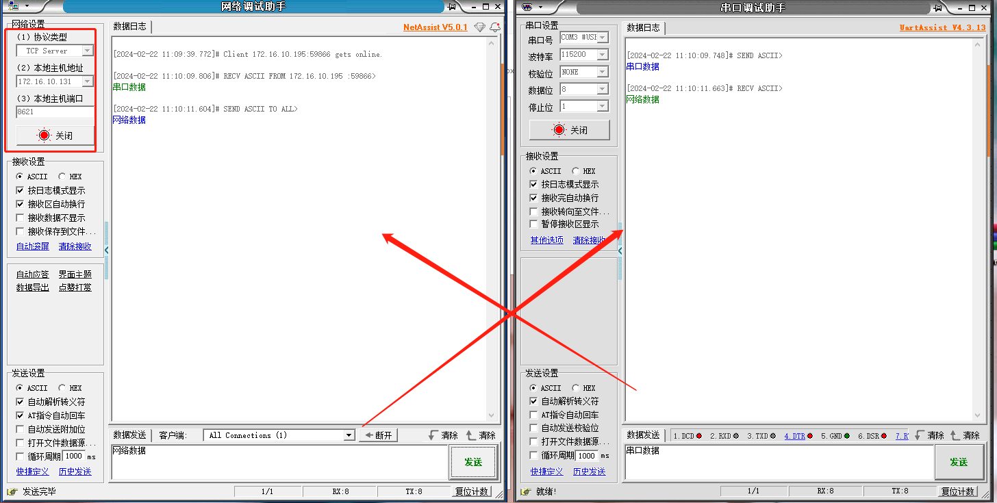 電腦上開一個網(wǎng)絡(luò)調(diào)試助手為server,本地IP:172.16.10.131本地端口為:8621