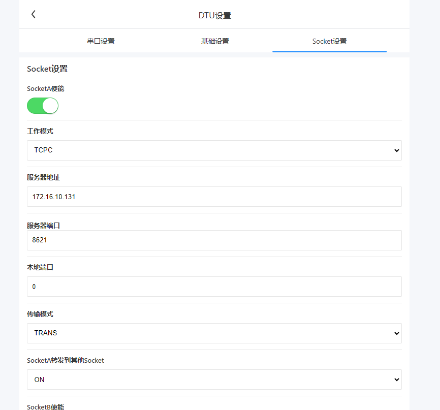 5、socket設(shè)置--配置G815為TCPC,連接遠(yuǎn)程服務(wù)器地址和端口。保存重啟生效。