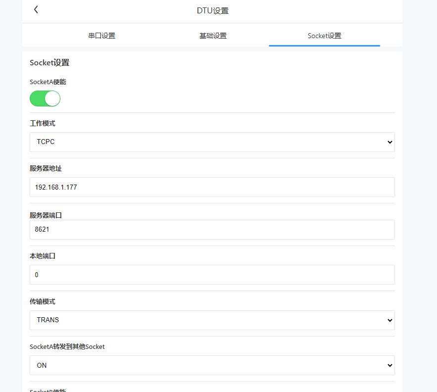 3、socket設(shè)置--配置G815為TCPC,連接遠(yuǎn)程服務(wù)器地址和端口。保存重啟生效。