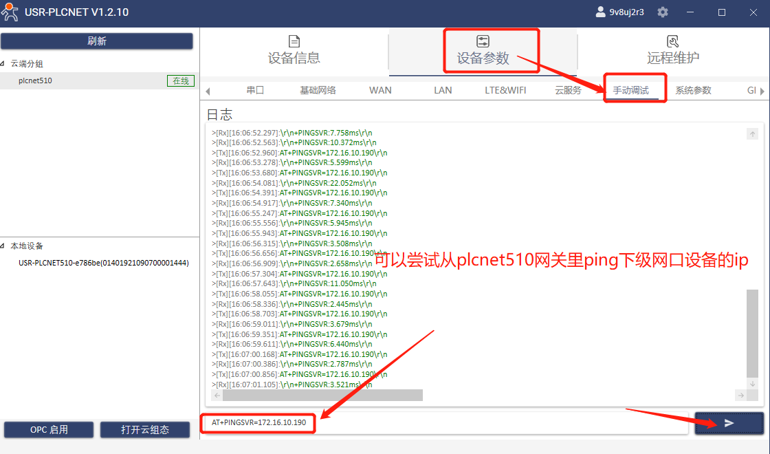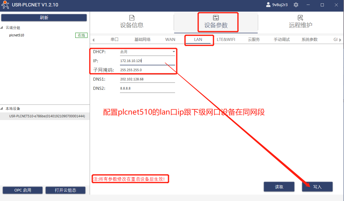 (2)打開“設(shè)備參數(shù)”---“LAN”---配置LAN口ip與下級(jí)設(shè)備在同網(wǎng)段,參數(shù)需要重啟才會(huì)生效。配置完參數(shù)后,可以在“手動(dòng)調(diào)試”頁面ping一下下級(jí)設(shè)備的ip,ping通說明網(wǎng)絡(luò)連接正常。