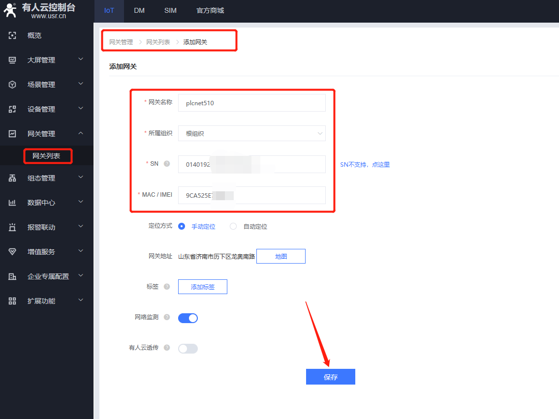 (1)登錄有人云賬號(hào),點(diǎn)擊“網(wǎng)關(guān)管理”---“網(wǎng)關(guān)列表”---輸入PLCNET510背后的SN和MAC,點(diǎn)擊“保存”