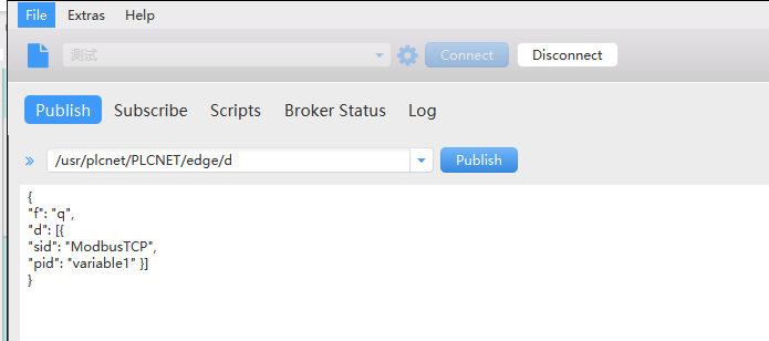 6、發(fā)布指定主題與內(nèi)容,設(shè)備回復(fù)對應(yīng)數(shù)據(jù)(sid:有人云模板中從機(jī)名稱;pid:添加變量點(diǎn)時配置的變量標(biāo)識符)