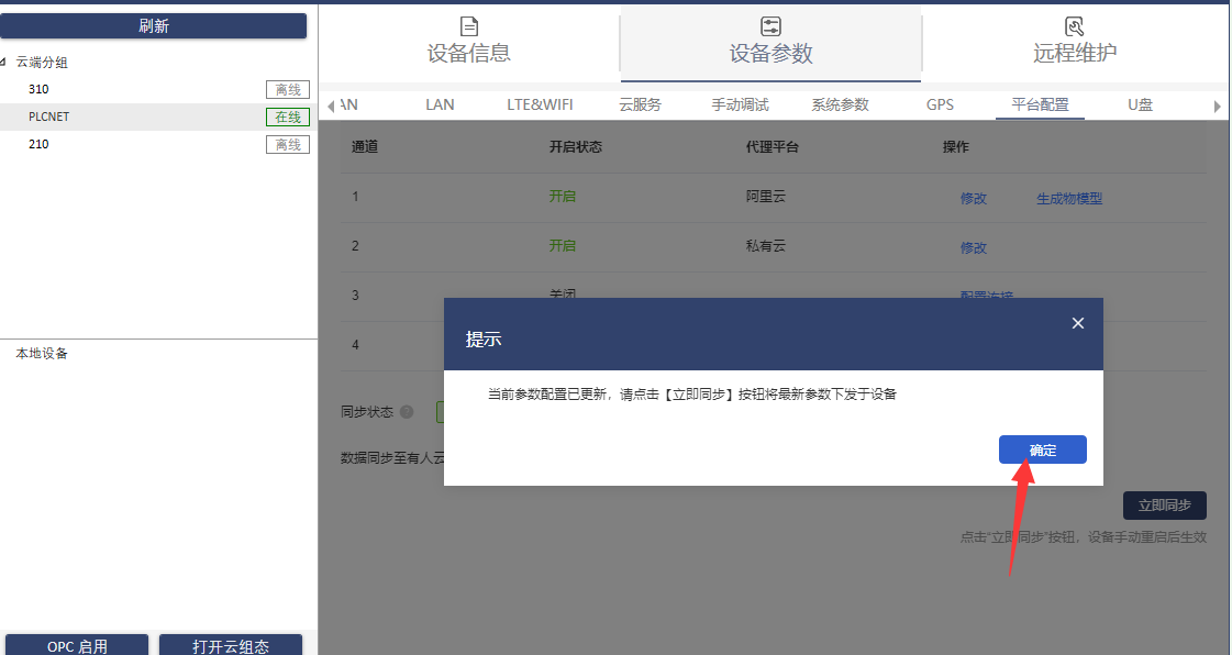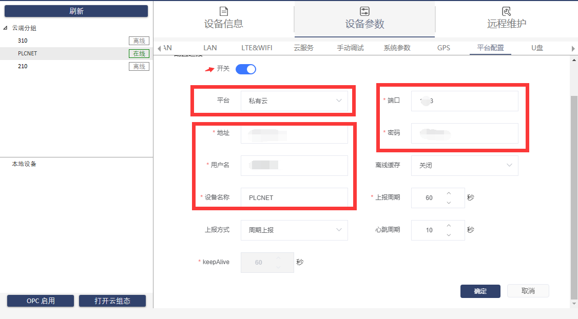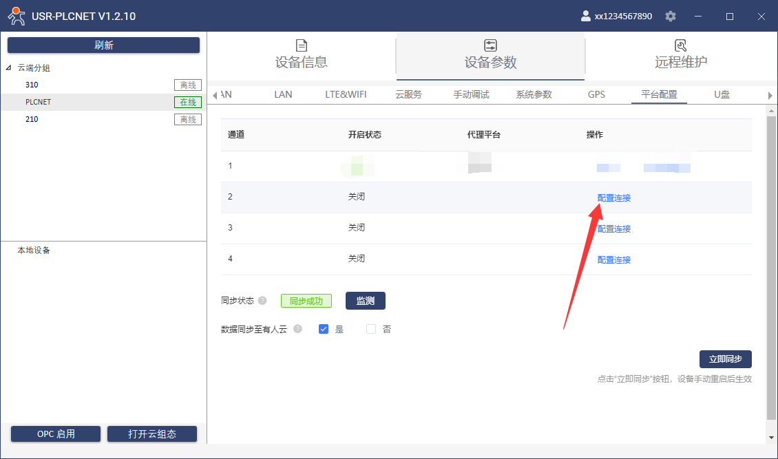 1、打開配置軟件,點(diǎn)擊設(shè)備,選擇設(shè)備參數(shù)-平臺配置頁面,配置連接