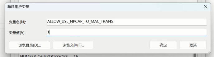 (3)新建一個用戶變量,配置變量名ALLOW_USE_NPCAP_TO_MAC_TRANS值為1