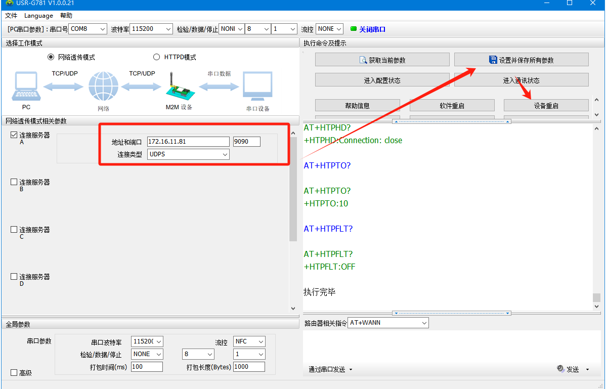 (5)勾選鏈接服務器A,填寫PC的IP和監(jiān)聽端口,鏈接類型選擇UDPC,即UDC Client。設置完參數(shù)點擊“設置并保存所有參數(shù)”,執(zhí)行完畢后,點擊軟件重啟,待串口打印啟動信息,如“USR-G781”,代表設備重啟完畢。