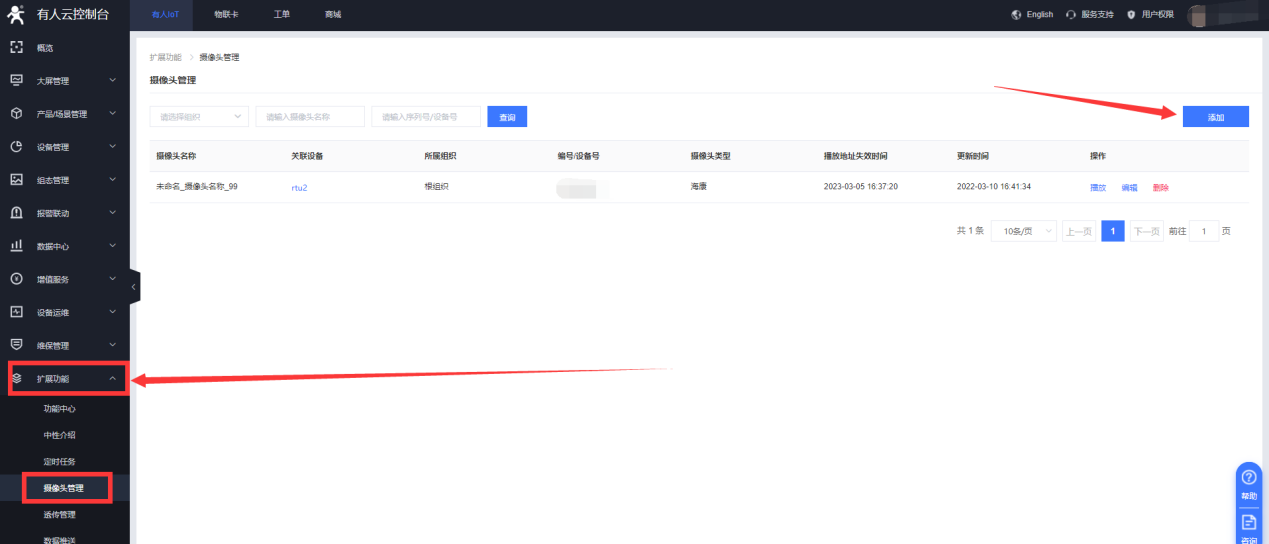 (1)登陸有人云平臺(tái)后在左側(cè) 擴(kuò)展功能-功能中心 中開(kāi)通《攝像頭管理》功能,便可在下拉列表中找到該功能,點(diǎn)擊并選擇添加一個(gè)攝像頭