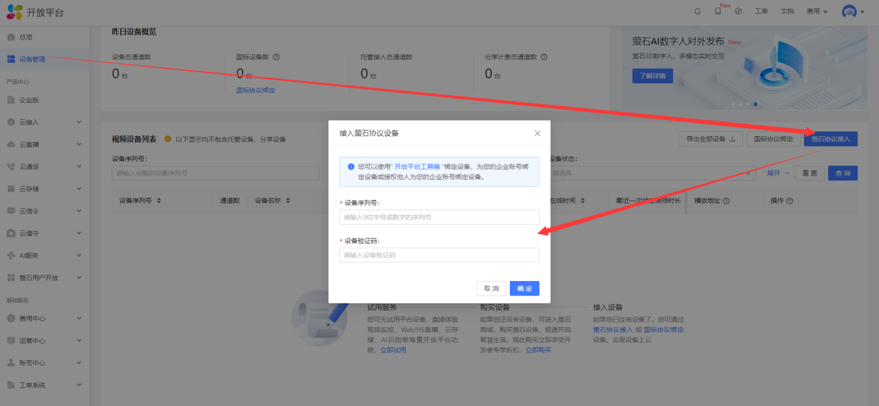(2)在彈出的對(duì)話框中寫入攝像頭標(biāo)簽上的序列號(hào)與驗(yàn)證碼,點(diǎn)確定