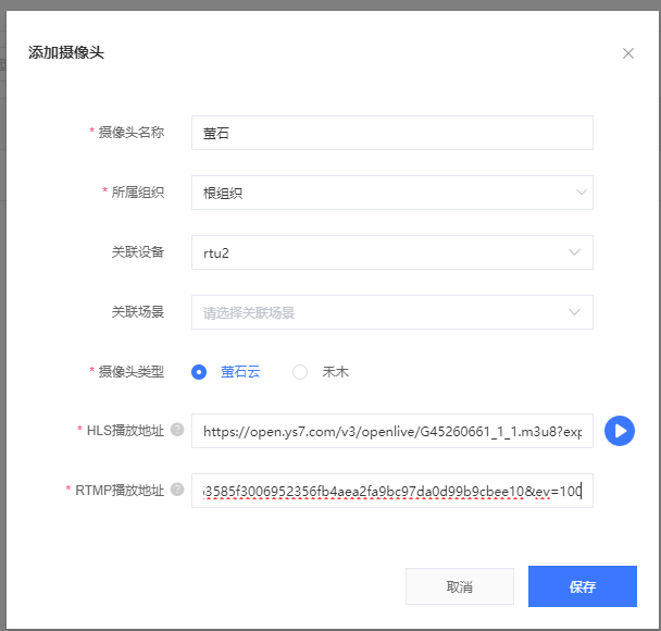 (2)目前支持可接入螢石云平臺(tái)的??禂z像頭,設(shè)置攝像頭的名稱,將之前查找到的HLS地址與RTMP地址復(fù)制到播放地址中,點(diǎn)擊后面的藍(lán)色播放按鈕可預(yù)覽畫面,選擇所屬組織,可選擇需要掛載在哪個(gè)設(shè)備下面,點(diǎn)保存。