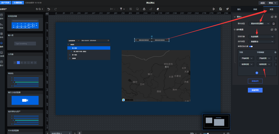 7、點擊時間選擇器配置交互,更改時間范圍時控制軌跡地圖的數據聯(lián)動,字段與映射配置開始時間與結束時間