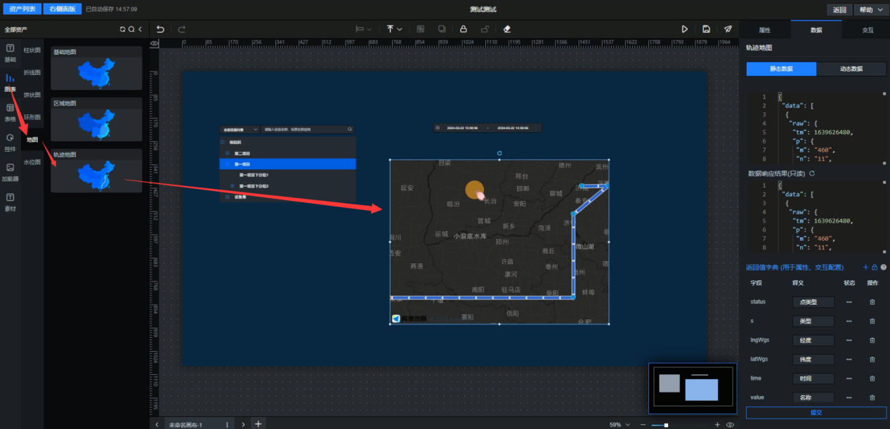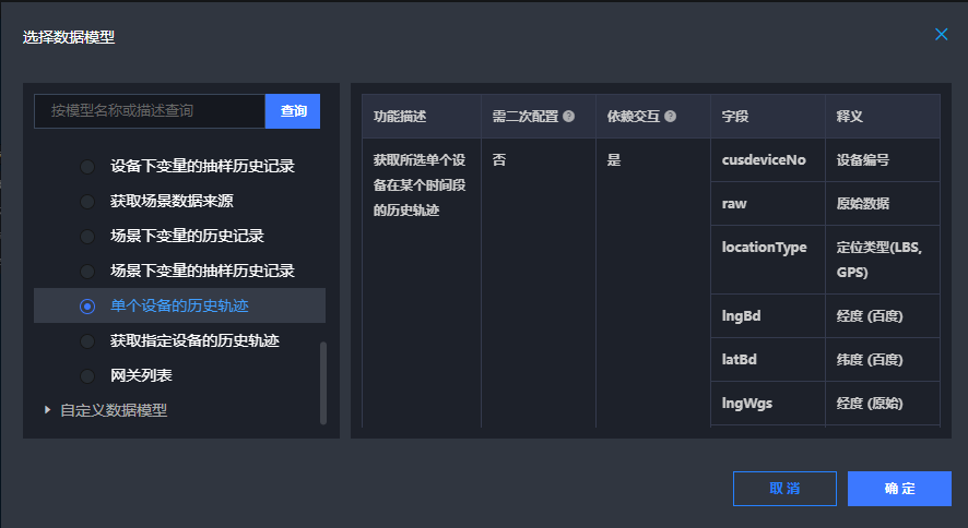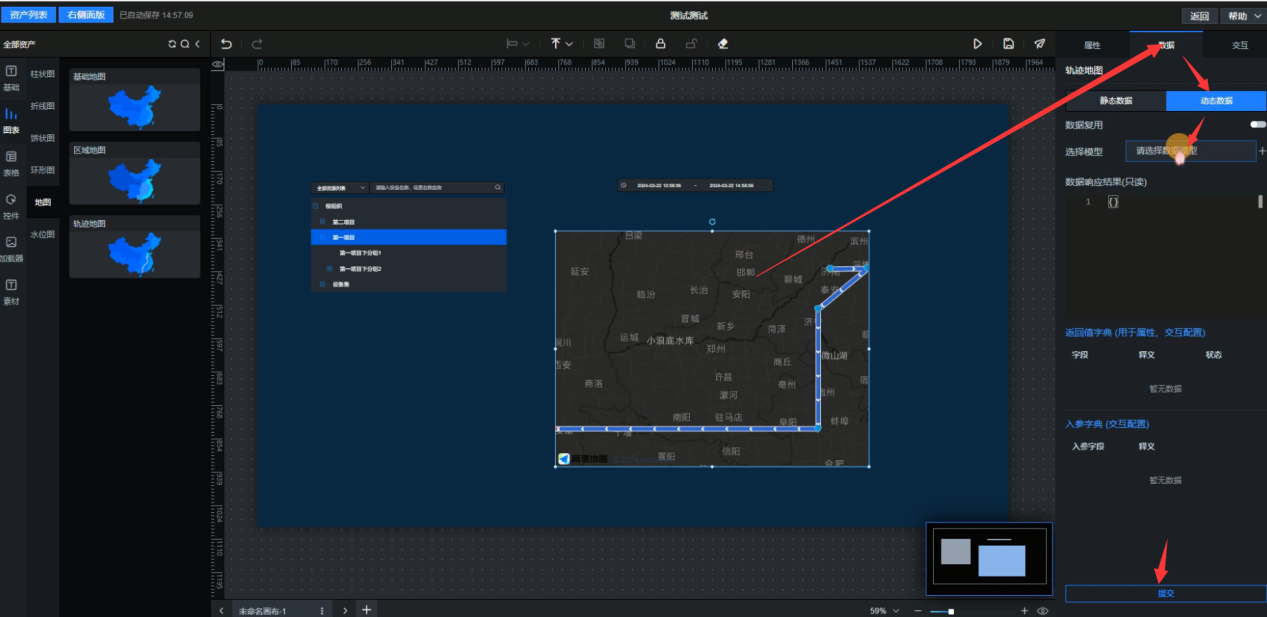 4、點擊地圖,在數據中綁定動態(tài)數據,選擇“單個設備的歷史軌跡”數據模型