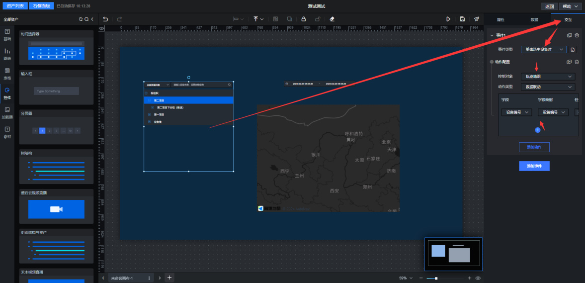 6、點擊組織結構資產下拉框配置交互,單擊選中設備時控制軌跡地圖的數據聯(lián)動,字段與映射都是設備編號