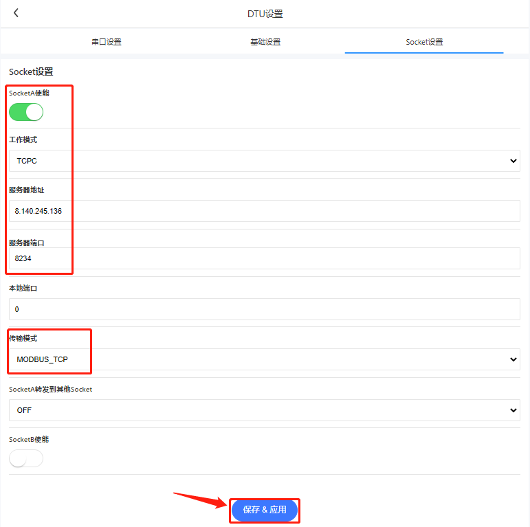 點擊“Socket設(shè)置”,開啟“SocketA使能”開關(guān),工作模式配置為“TCPC”,服務(wù)器地址與服務(wù)器端口配置為用戶自己實際要連接的服務(wù)器ip與端口,傳輸模式配置為“MODBUS_TCP”,點擊保存應(yīng)用。