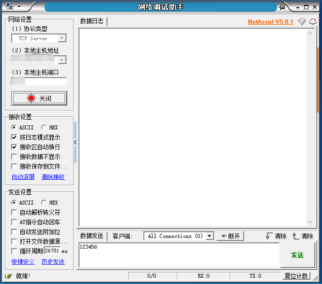 在公網(wǎng)服務(wù)器使用網(wǎng)絡(luò)調(diào)試助手開啟TCP server服務(wù)。