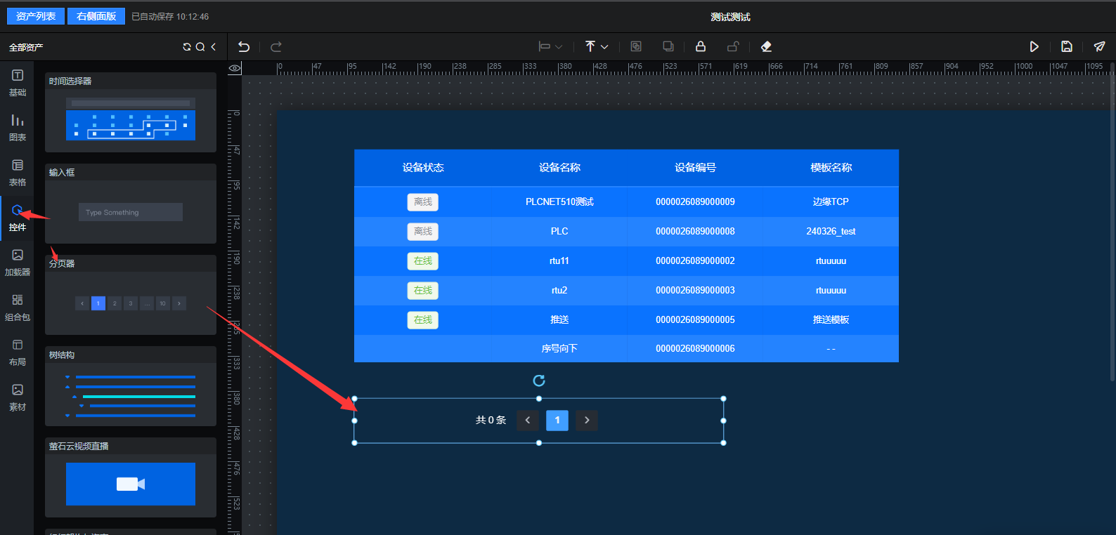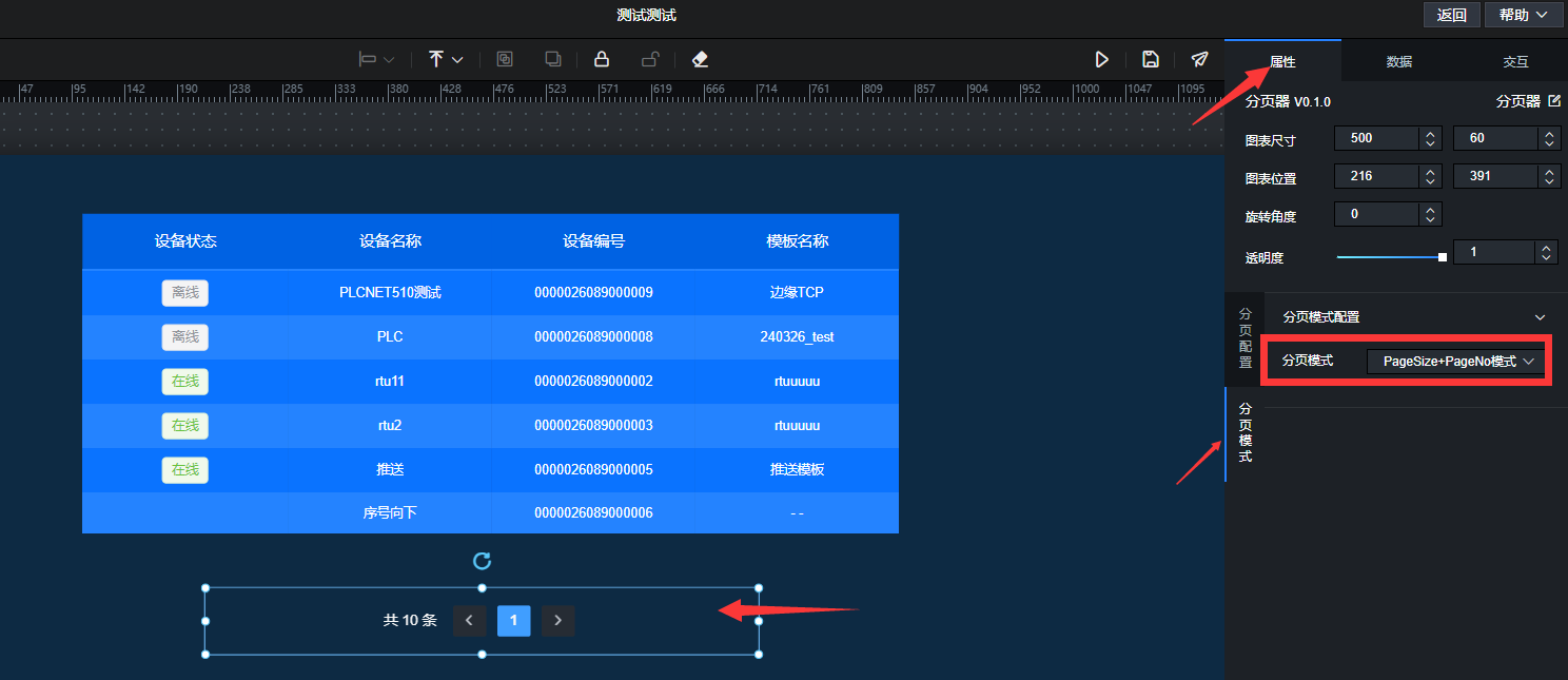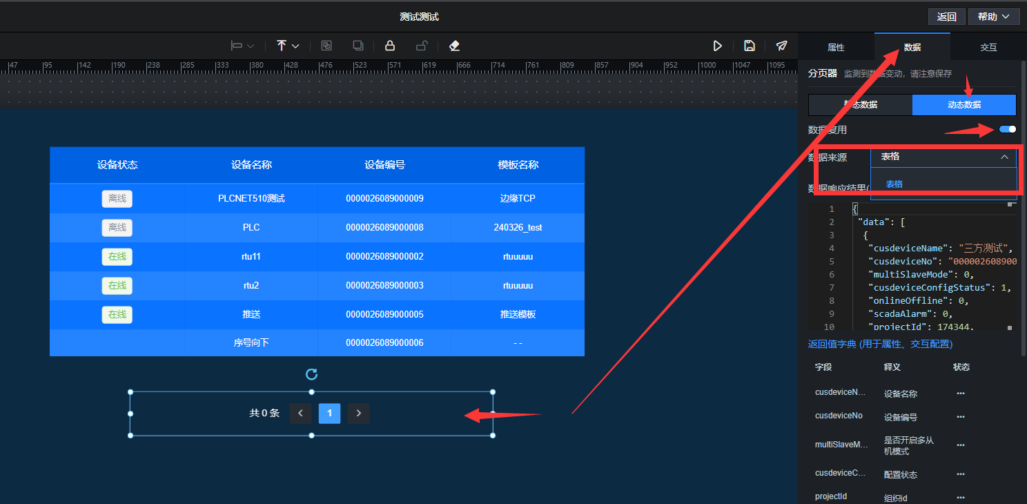 (2)選中分頁(yè)器,在數(shù)據(jù)設(shè)置中,設(shè)置為動(dòng)態(tài)數(shù)據(jù),開(kāi)啟分享模型,選擇設(shè)備表格元件