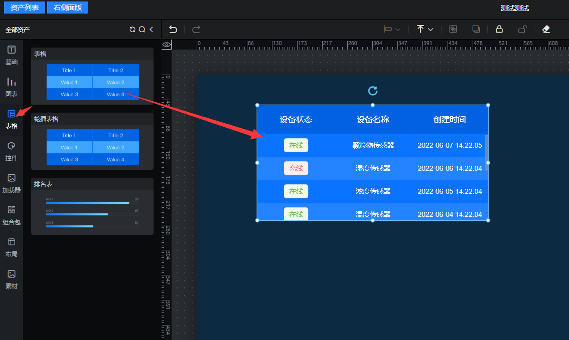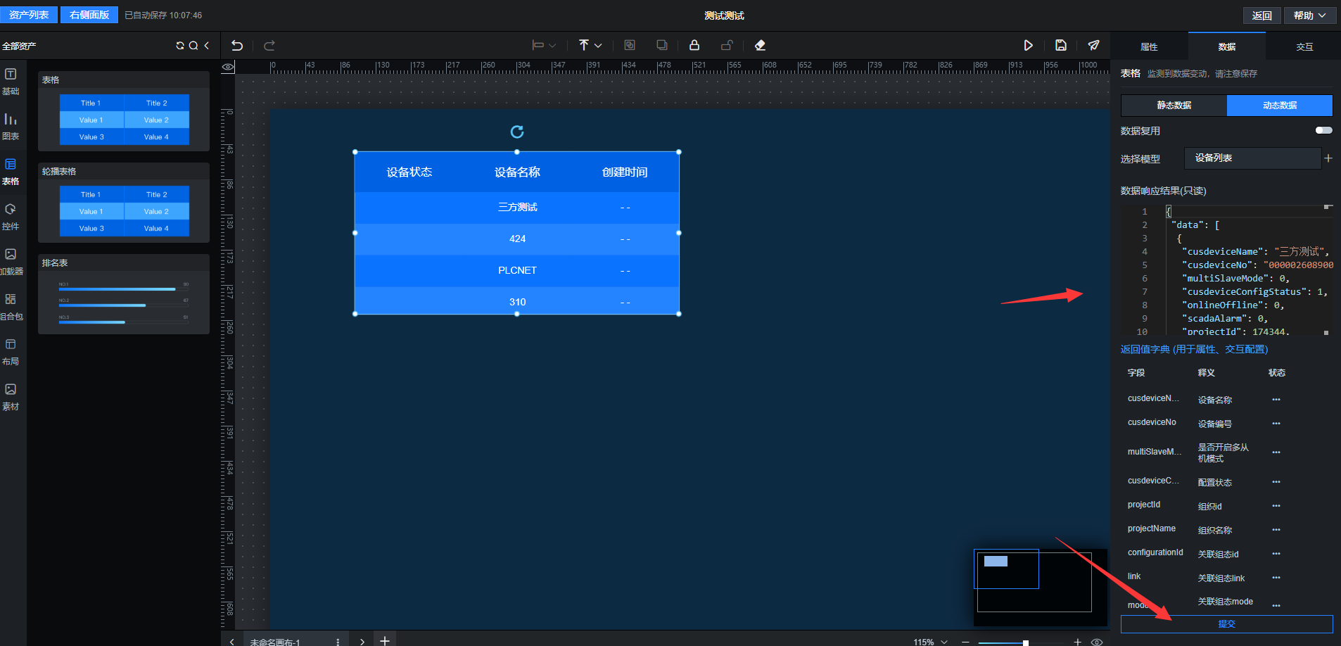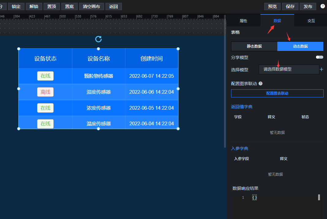 (2)選中表格,在數(shù)據(jù)設(shè)置中,設(shè)置為動(dòng)態(tài)數(shù)據(jù),點(diǎn)擊選擇模型后的空白處選擇設(shè)備模型