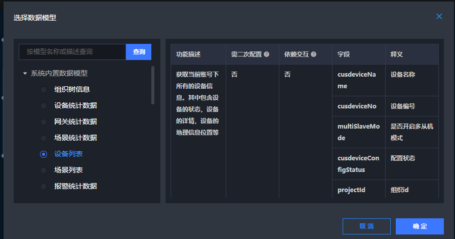 (3)在 系統(tǒng)內(nèi)置數(shù)據(jù)模型 中選中設(shè)備列表后,點(diǎn)擊確定