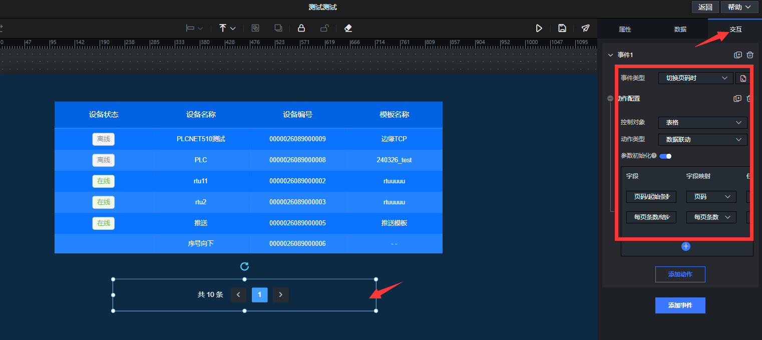 (1)選中設(shè)備元件,在交互中綁定事件“切換頁(yè)碼時(shí)”數(shù)據(jù)聯(lián)動(dòng)表格,綁定頁(yè)碼與每頁(yè)條數(shù)的字段與映射