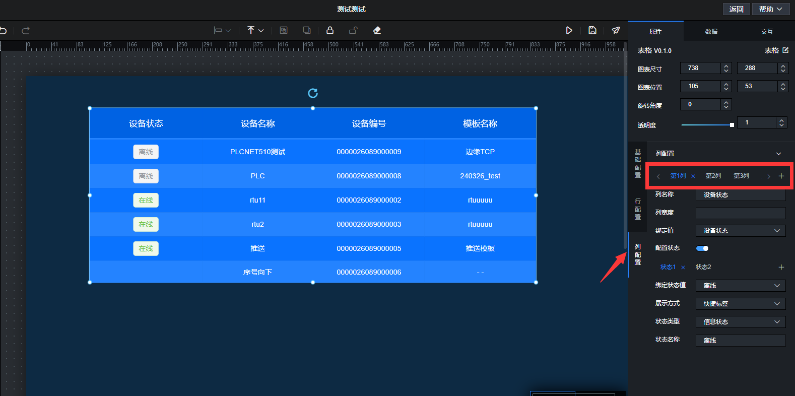 (5)在屬性設(shè)置-列設(shè)置中,添加需要的列數(shù)并綁定對(duì)應(yīng)的參數(shù)后,表格內(nèi)出現(xiàn)對(duì)應(yīng)數(shù)據(jù)