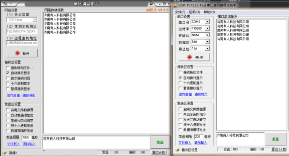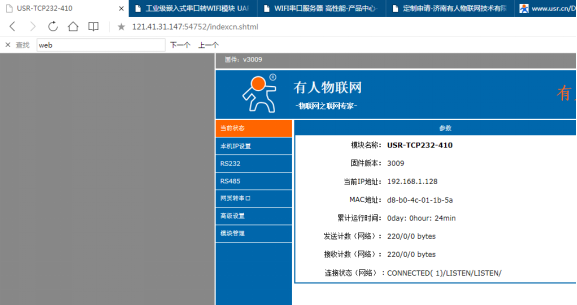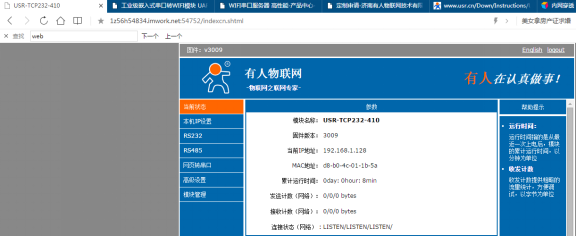 本文測(cè)試使用的網(wǎng)口設(shè)備為USR-TCP232-410S 實(shí)現(xiàn)的功能是訪問(wèn)410S內(nèi)置網(wǎng)頁(yè)及連接410S的TCP Server透?jìng)鲾?shù)據(jù)。410S的IP為192.168.1.128,網(wǎng)頁(yè)端口80,TCP Server監(jiān)聽端口23。