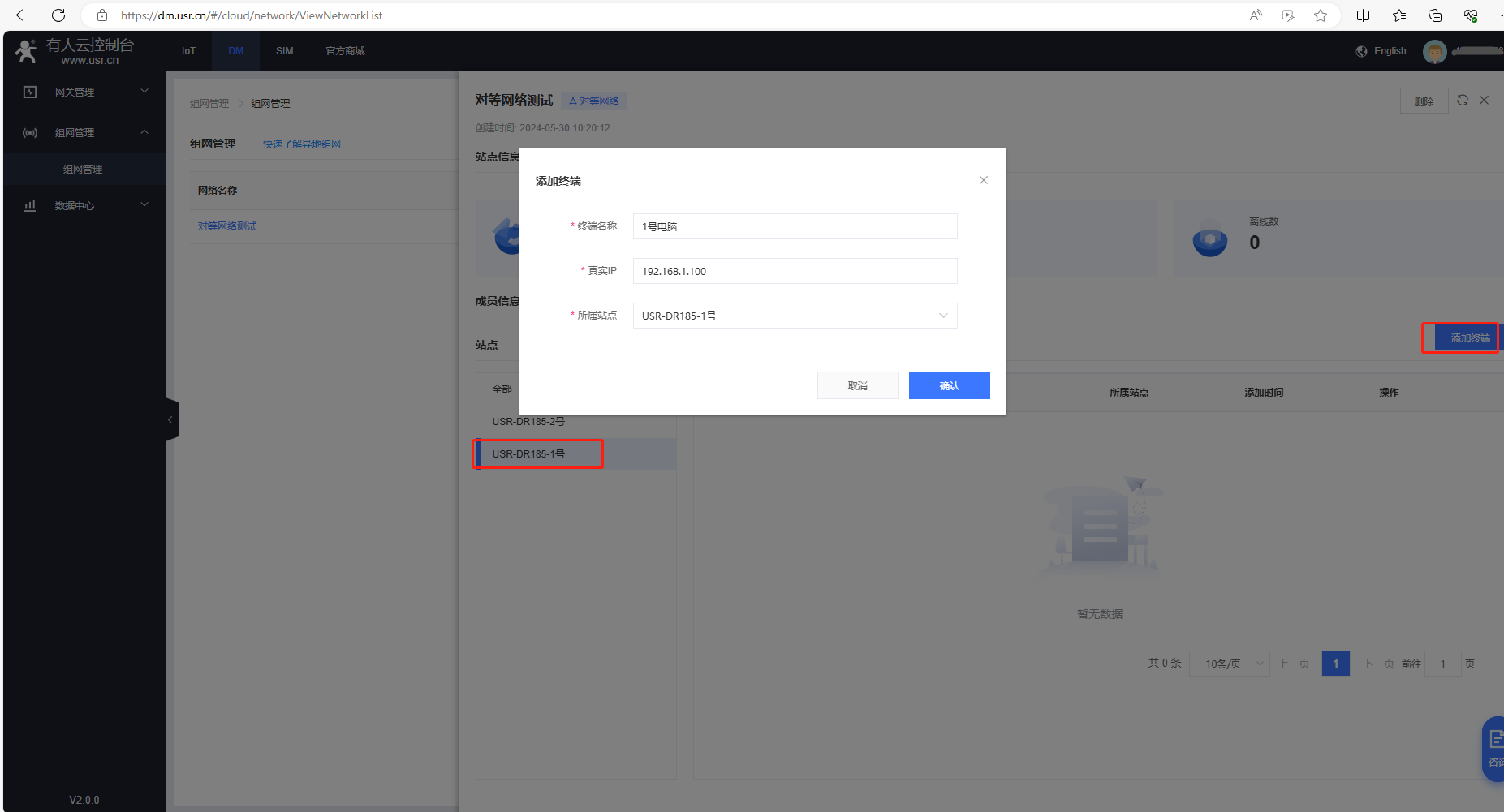 (2)添加終端,終端名稱填1號電腦,真實(shí)IP填192.168.1.100,所屬站點(diǎn)是USR-DR185-1號,點(diǎn)擊確認(rèn)。