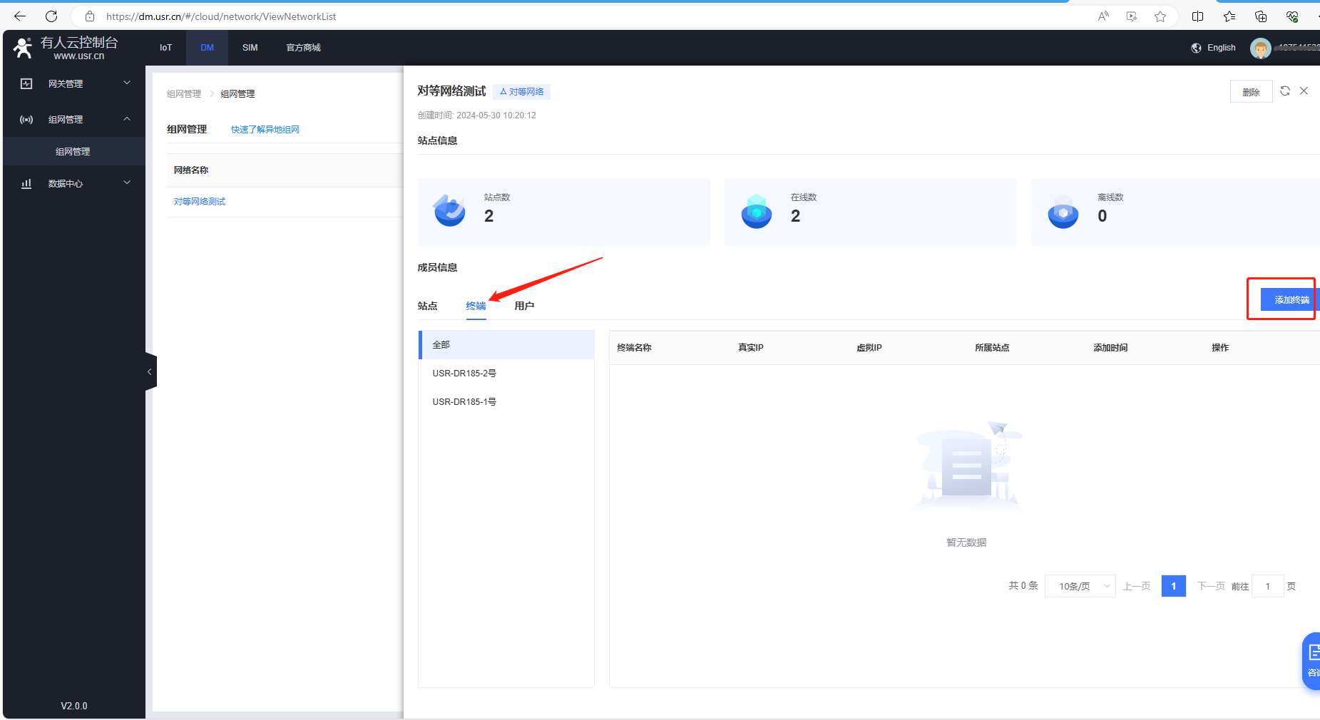 (1)對等網(wǎng)絡(luò)測試頁面,點(diǎn)擊終端,點(diǎn)擊添加終端。