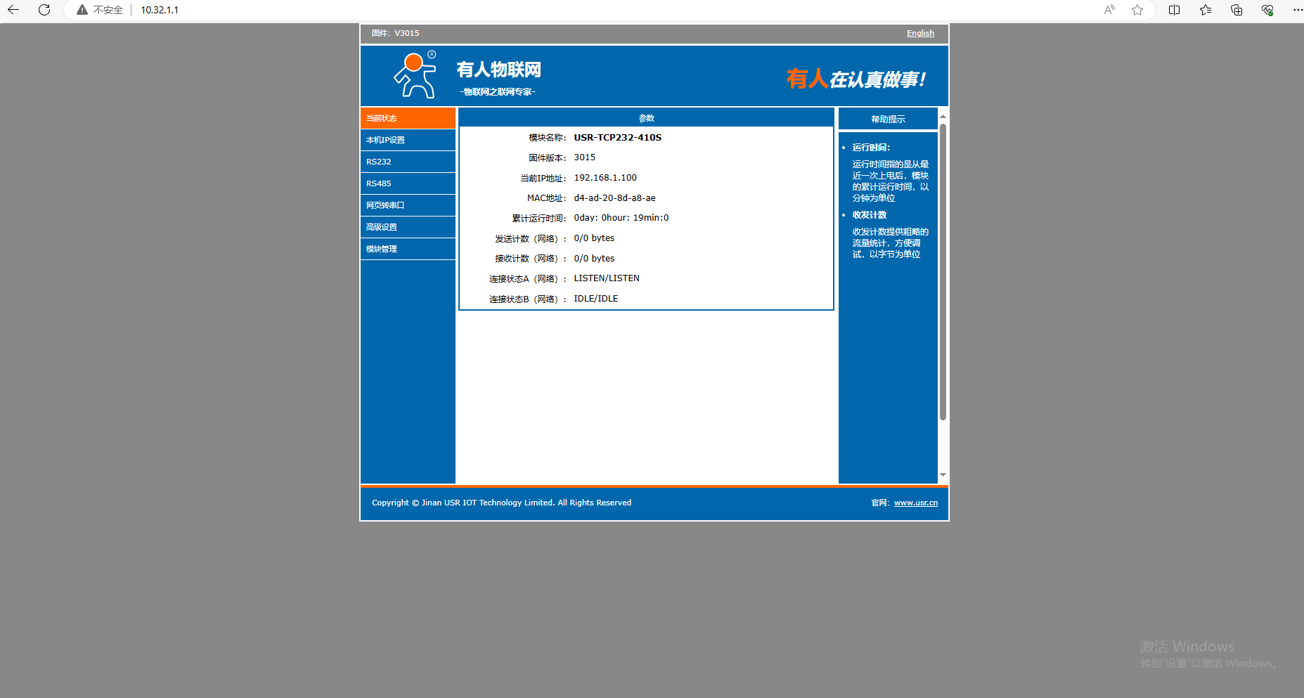 主用戶客戶端所在的3號電腦,瀏覽器輸入1號終端對應(yīng)的虛擬IP 10.32.1.1,可以訪問USR-TCP232-410S的內(nèi)置網(wǎng)頁。