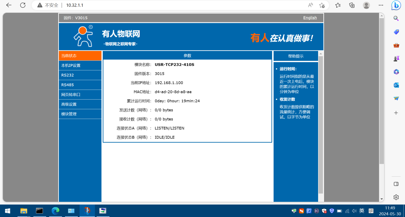 子用戶客戶端所在的4號電腦,瀏覽器輸入1號終端對應(yīng)的虛擬IP 10.32.1.1,也可以訪問USR-TCP232-410S的內(nèi)置網(wǎng)頁。