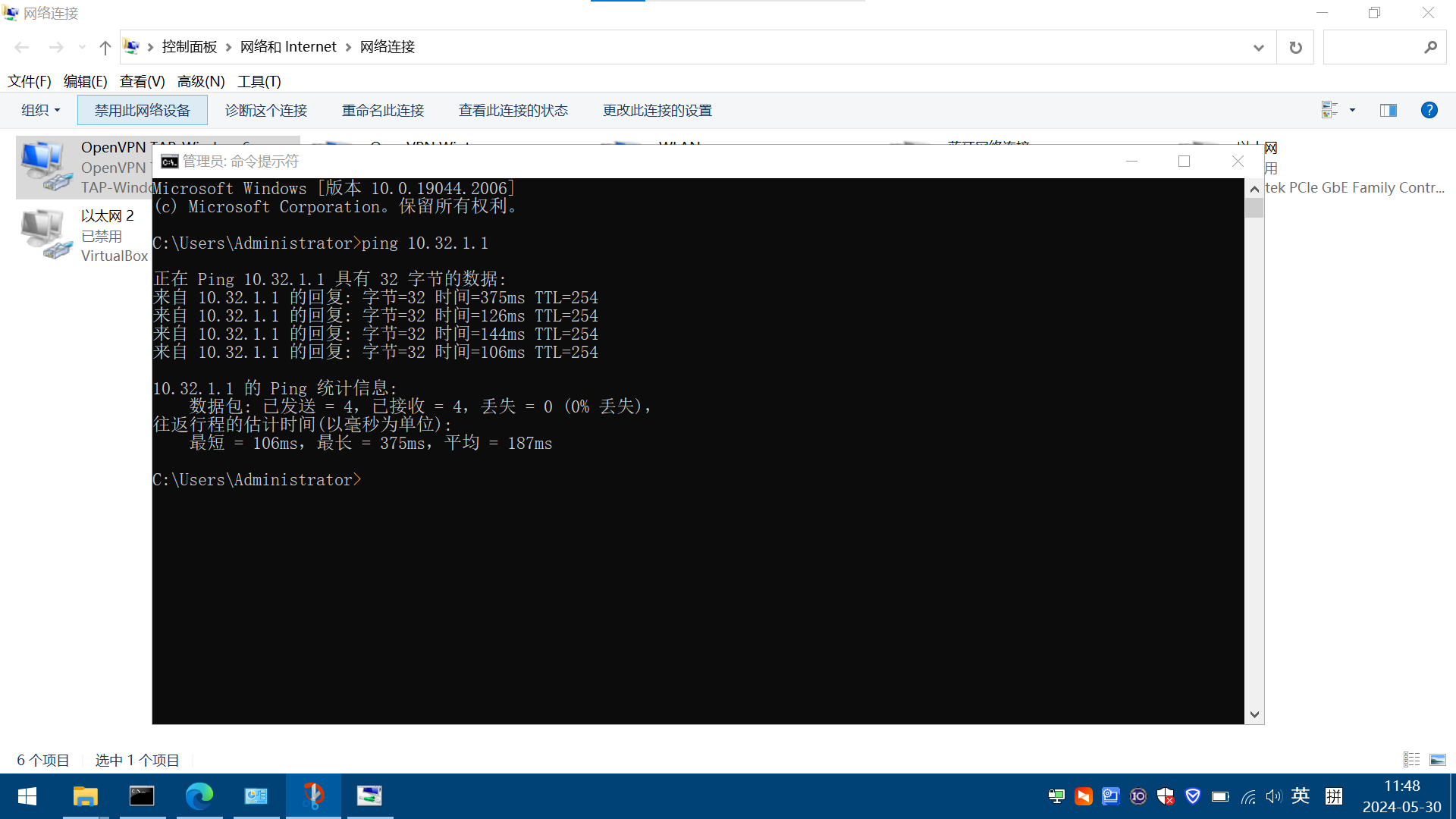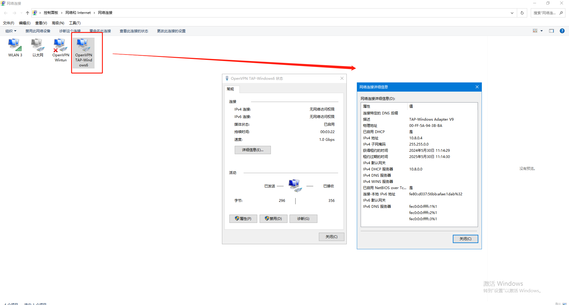 (4)電腦控制面板,查看網(wǎng)絡(luò)連接,OpenVPN TAP-Windows6網(wǎng)卡,查看IPv4的IP是10.8.0.4