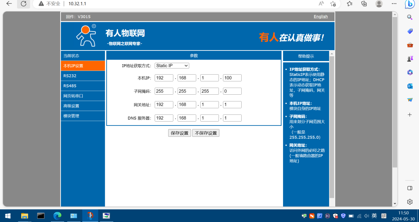 舉例:用有人公司的串口服務(wù)器,USR-TCP232-410S,提前設(shè)置靜態(tài)IP,192.168.1.100,子網(wǎng)掩碼255.255.255.0,網(wǎng)關(guān)192.168.1.1