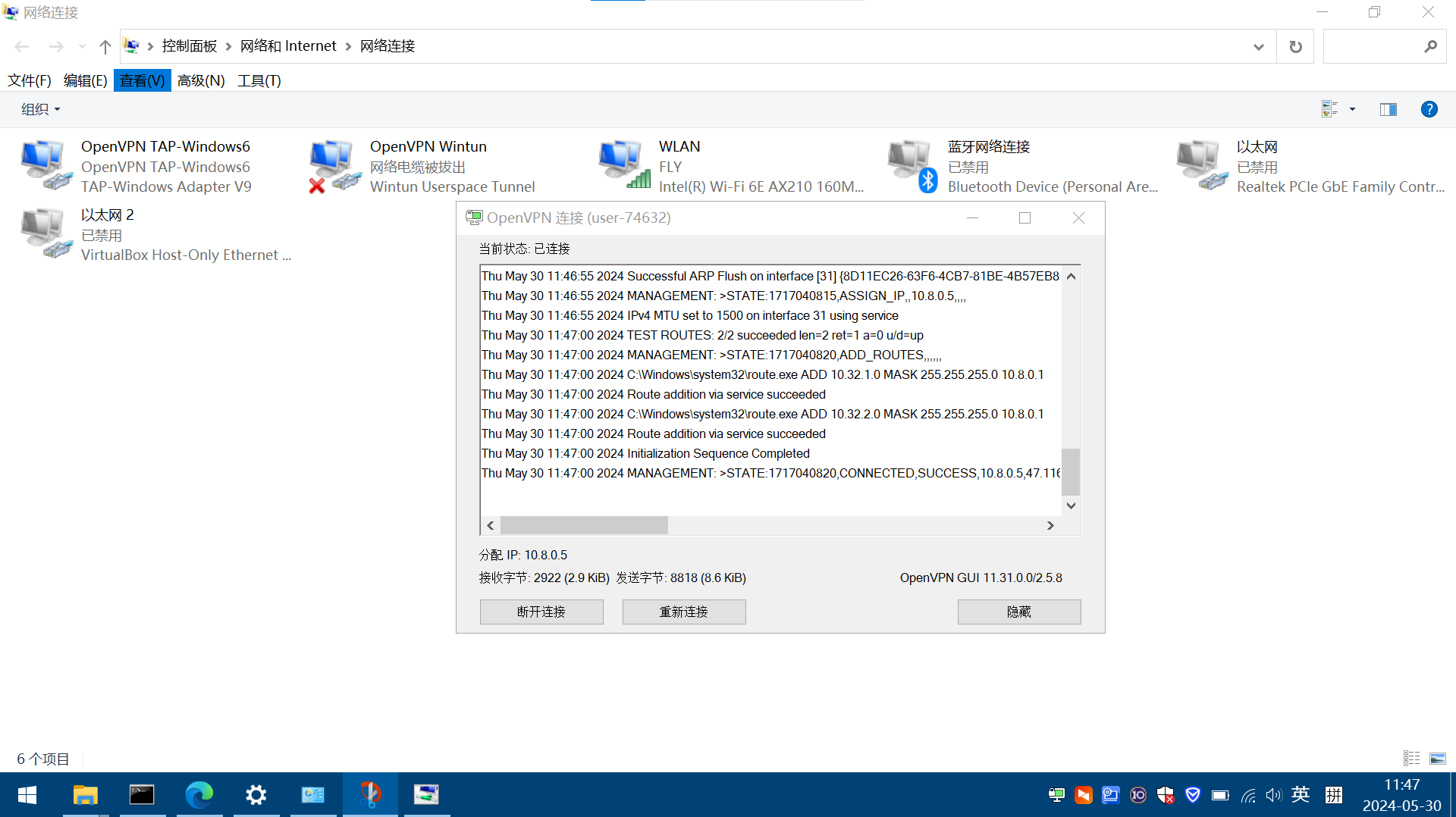 (4)電腦控制面板,查看網(wǎng)絡(luò)連接,OpenVPN TAP-Windows6網(wǎng)卡,查看IPv4的IP是10.8.0.5