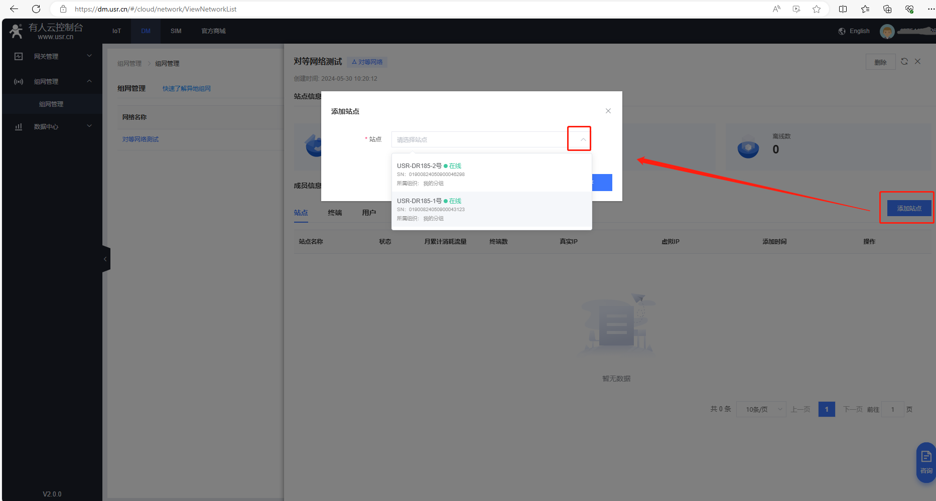 2、添加站點(diǎn),添加1臺USR-DR185