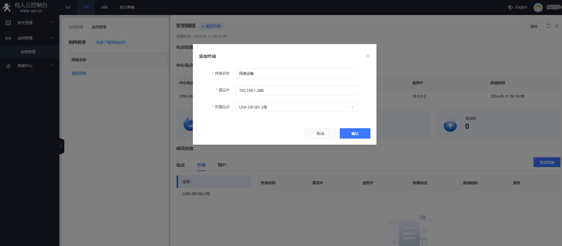 (2)添加終端,終端名稱填網(wǎng)絡(luò)設(shè)備,真實(shí)IP填192.168.1.200,所屬站點(diǎn)是USR-DR185-2號(hào),點(diǎn)擊確認(rèn)。
