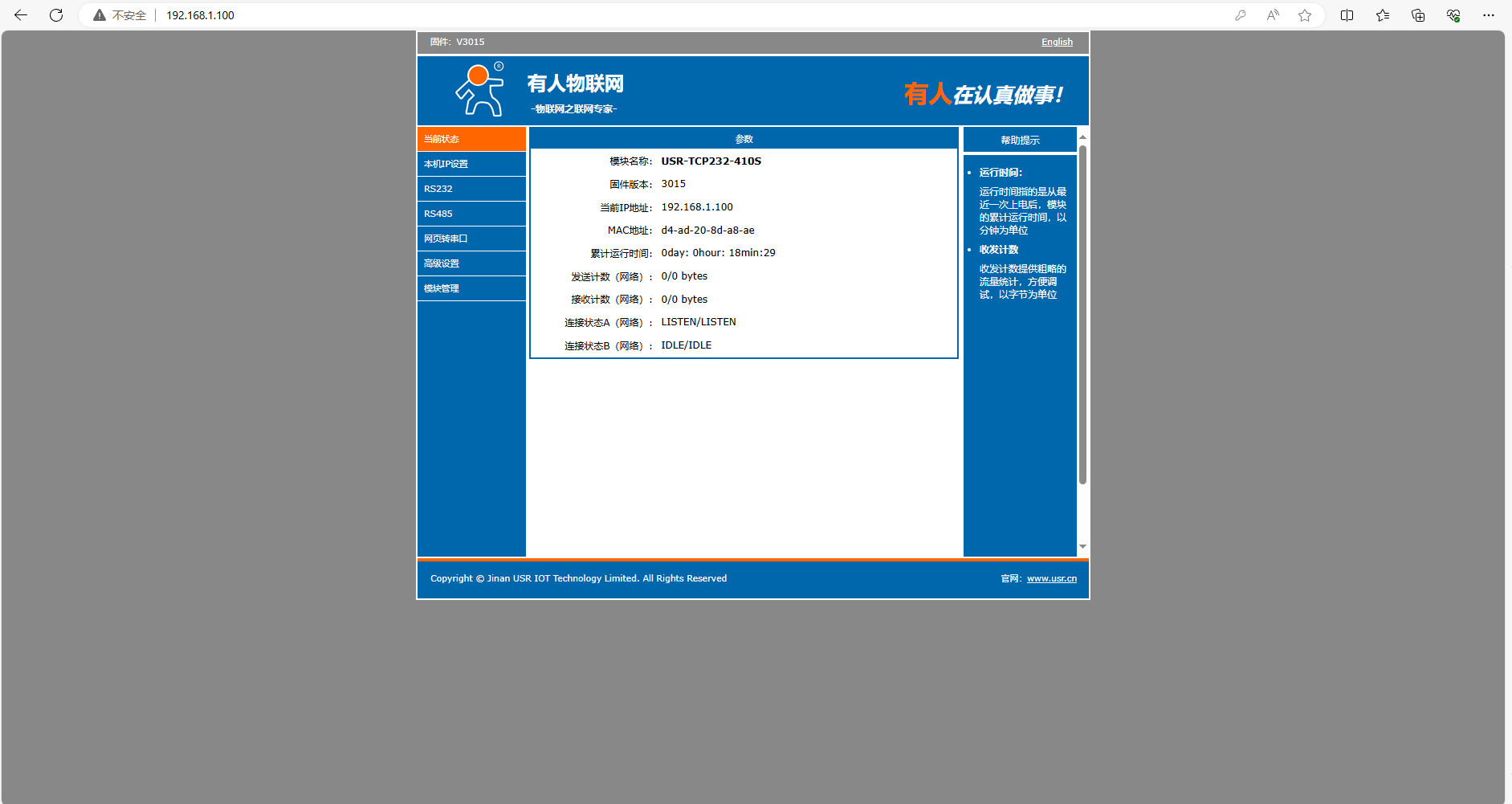 客戶端所在的3號(hào)電腦PC3,瀏覽器輸入中心站點(diǎn)終端的真實(shí)IP 192.168.1.100,可以訪問(wèn)USR-TCP232-410S的內(nèi)置網(wǎng)頁(yè)。