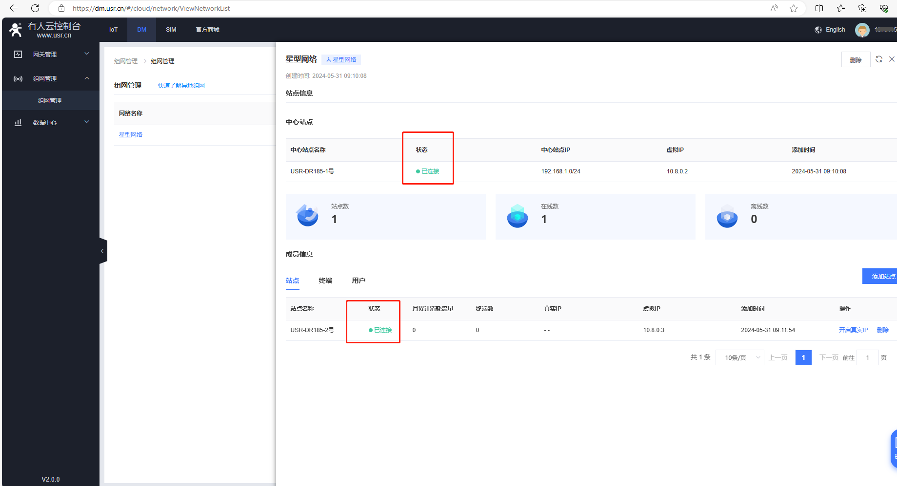 (3)星型網(wǎng)絡(luò),可以看到中心站點(diǎn)USR-DR185-1號(hào)狀態(tài)已連接,站點(diǎn)USR-DR185-2號(hào)狀態(tài)已連接。