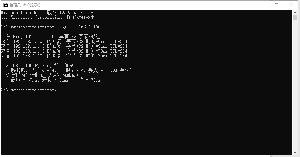 客戶端所在的3號(hào)電腦PC3,可以PING通中心站點(diǎn)USR-DR185-1號(hào)下終端電腦PC1的真實(shí)IP:192.168.1.100。