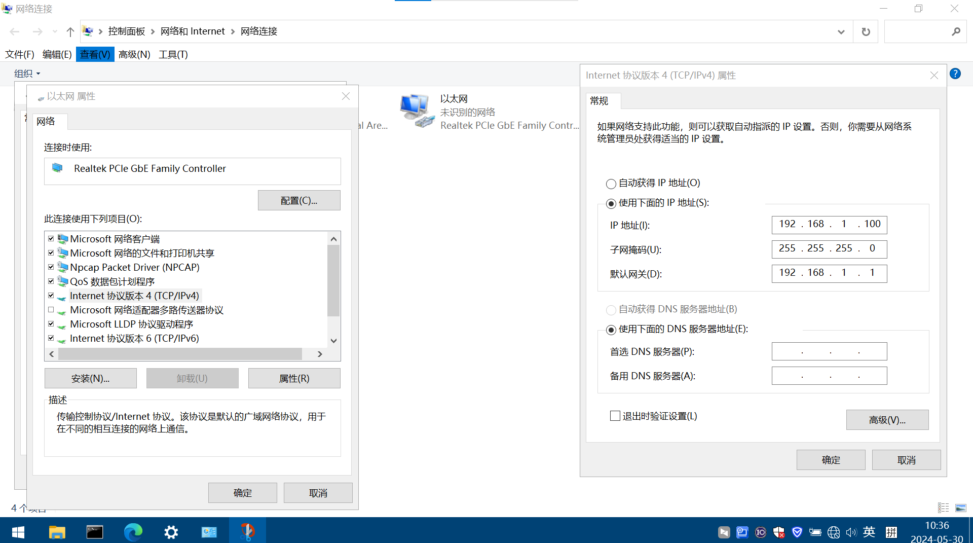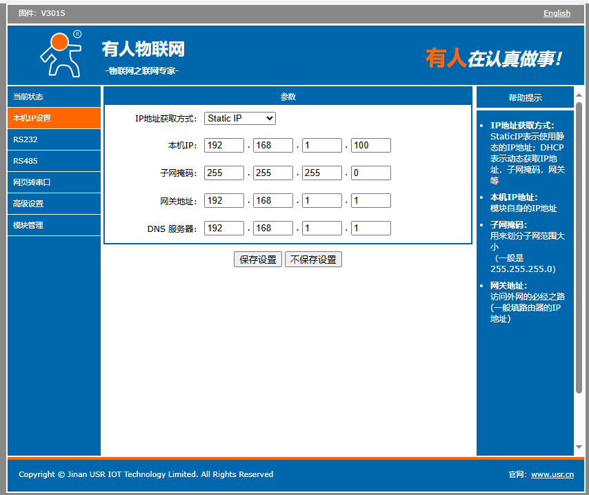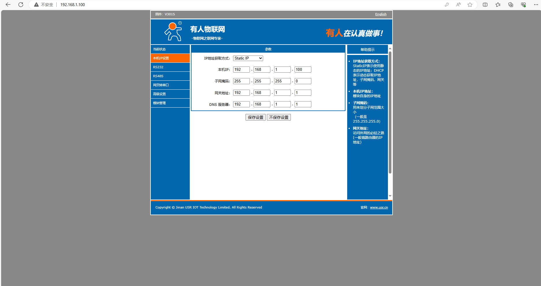 舉例:用有人公司的串口服務(wù)器,USR-TCP232-410S,提前設(shè)置靜態(tài)IP,192.168.1.100,子網(wǎng)掩碼255.255.255.0,網(wǎng)關(guān)192.168.1.1
