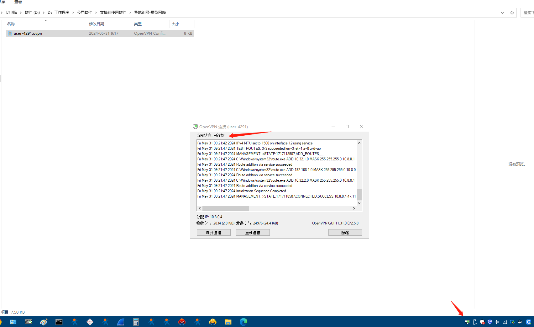 (3)客戶端OPENVPN連接后,客戶端小圖標(biāo)顯示綠色,表示已連接。